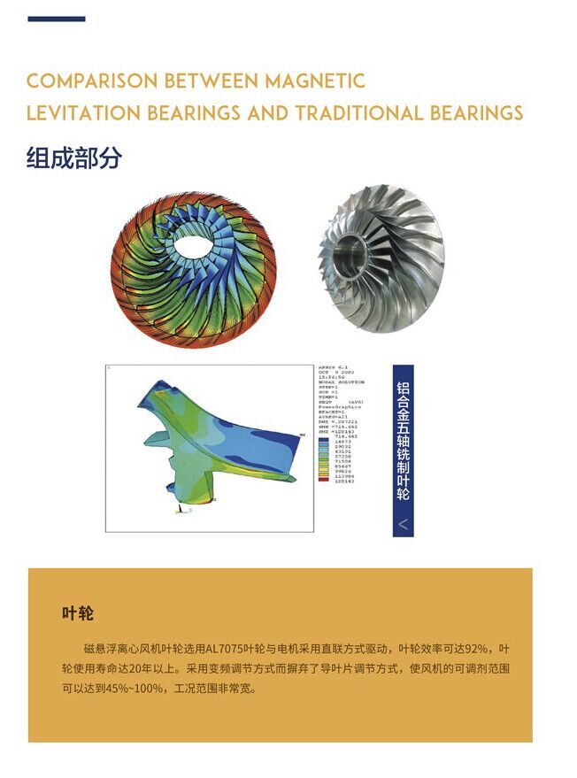 磁悬浮离心风机的叶轮采用AL7075铝合金材质,通过与电机直接连接驱动。叶轮效率可达92%,使用寿命可达20年以上。风机转速调节范围可达45%~100%,工作范围非常宽广。