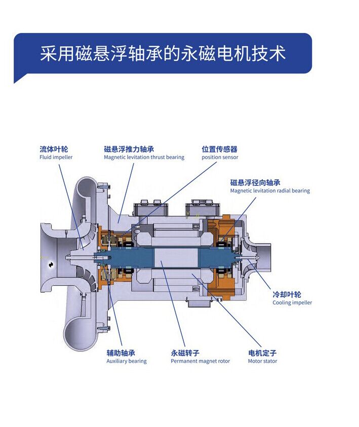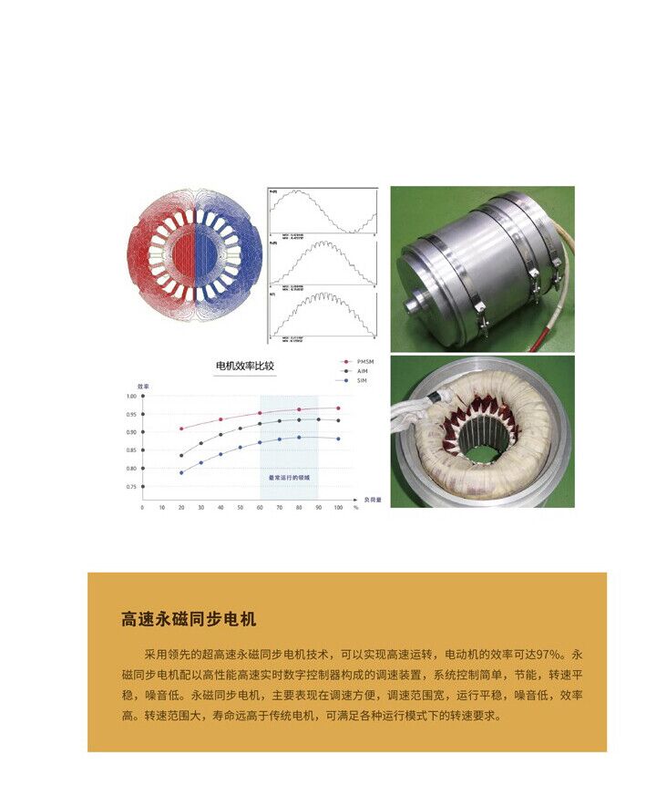 采用领先的超高速永磁同步电机技术,可实现高速运行,电机效率可达97.9%。永磁同步电机配备由高性能高速实时数字控制器组成的调速装置。该系统具有控制简便、节能、转速稳定、噪音低等优点。永磁同步电机的主要特点是调速方便、调速范围宽、运行稳定、噪音低、效率高。其调速范围大,使用寿命远超传统电机,能够满足各种运行模式下的转速需求。