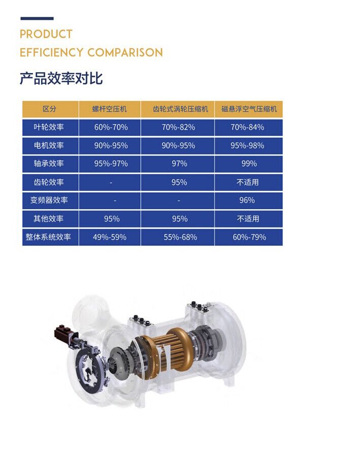 集成磁悬浮轴承、高速永磁同步电机、高效流体部件、专用控制系统以及一系列先进技术,使整机高效节能。与传统罗茨鼓风机相比,效率提升30%~40%。以160kW磁悬浮鼓风机为例,每台每年可比传统罗茨鼓风机节省50万度以上的电能,成本可在1~2年内收回。